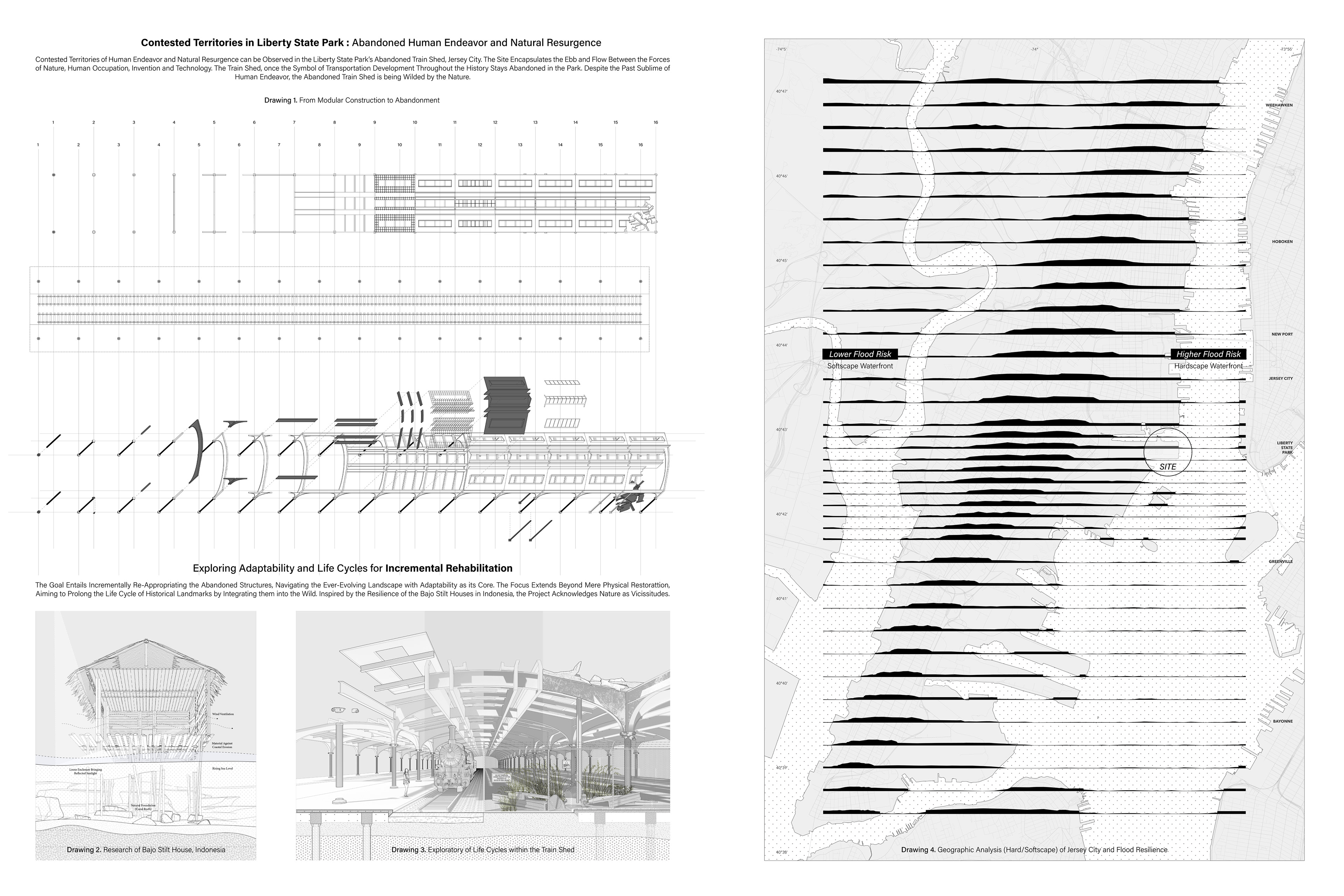 Situated in the Contested Territories between the Wild and Willed, the "Contingency Plan" Emerges as a Proactive Response to the Inevitable Rise of Sea Levels, Expected to Ascend Up to 9 feet in the Next Century due to Current Carbon Emissions. The Goal Entails Incrementally Re-Appropriating the Abandoned Train Shed in Liberty State Park, Navigating the Ever-Evolving Landscape with Adaptability at its Core. The Focus Extends Beyond Mere Physical Restoration, Aiming to Prolong the Life Cycle of Historical Landmarks by Integrating them into the Contested Territories.